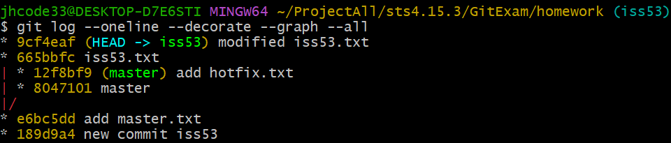 #이슈 처리하기 git checkout iss53 echo "iss53" >> iss53.txt git commit -a -m "modified iss53.txt" #확인 git log --oneline --decorate --graph --all