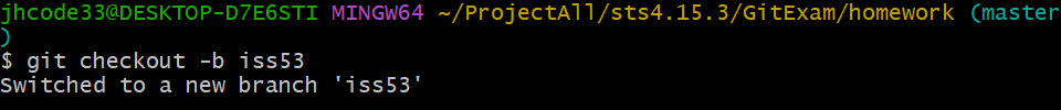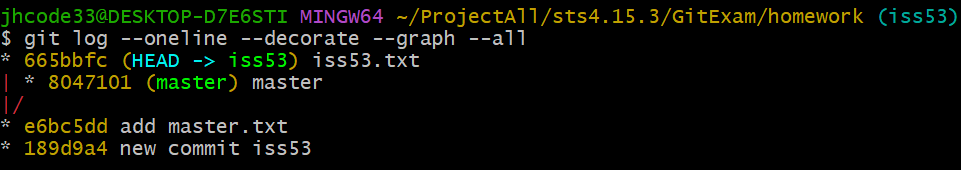 iss53은 아직 어떠한 작업도 수행하지 않았습니다. iss53에서 해당 이슈를 처리하고 새로운 commit을 생성해보겠습니다.