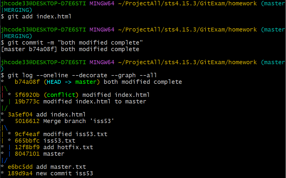 #conflict에 사용할 파일 준비 echo "<div id="footer">contact : jhcode33@gmail.com</div>" >> index.html git add index.html git commit "add index.html" #conflict 브런치 생성 및 commit 추가 git checkout -b conflict echo "<div id="footer"> please contact us at jhcode33@gmail.com </div>" >> index.html git commit -a -m "modified index.html" #master 브런치에서 index.html 수정 git checkout master echo "add conflict" >> index.html git commit -a -m "modified index.html to master"
