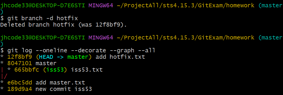 hotfix에서 문제를 해결하고 기존에 운영하던 master 브랜치에 합치려면 다음과 같은 명령어를 수행하면 됩니다. 이때 기존의 master 브랜치로 이동한 후 hotfix 브런치를 merge하면 됩니다.