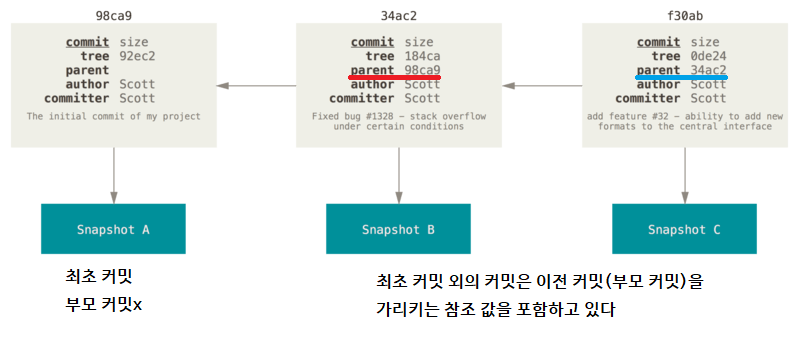 Git은 데이터를 변경사항(Diff) 대신 일련의 스냅샷으로 저장합니다. 커밋할 때 Git은 현재 스테이징 영역(Staging Area)에 있는 데이터의 스냅샷에 대한 포인터, 저자, 커밋 메시지 등의 메타데이터, 이전 커밋에 대한 포인터 등을 포함하는 커밋 객체(Commit Object)를 저장합니다. 이전 커밋 포인터를 통해 현재 커밋이 어떤 기준으로 변경되었는지를 알 수 있습니다. 최초 커밋을 제외한 모든 커밋은 적어도 하나의 이전 커밋 포인터를 가지며, 브랜치를 병합한 Merge 커밋과 같은 경우에는 여러 개의 이전 커밋 포인터가 있을 수 있습니다.