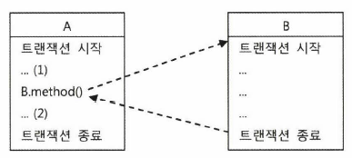 A, B는 각각 새로운 트랜잭션을 시작하기 때문에 독립적인 트랜잭션이 된다. 따라서 A의 (2)번 위치에서 예외가 발생해도, B는 커밋된다