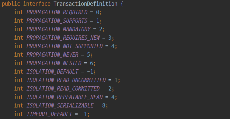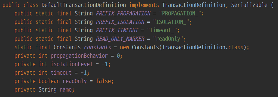 👉 DefaultTransactionDefinition에 설정된 격리수준 ISOLATION_DEFAULT이다. 이는 DMBS에 따라 DataSource에 설정된 디폴트 격리수준을 따른다.