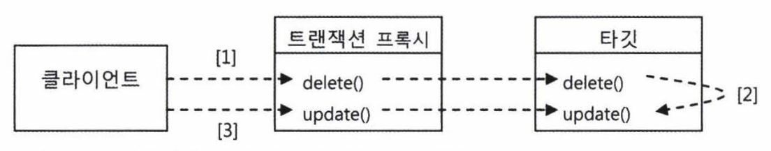 타겟 클래스의 메소드인 delete() 메소드 내에서 update() 메소드를 호출하는 경우[2], 트랜잭션이 전파되지 않는다. delete() 메소드가 트랜잭션을 시작하거나, 앞선 트랜잭션에 참여했기 때문에 전파될 것 같다. 하지만 프록시 방식의 AOP는 프레임워크가 프록시 객체의 메소드 호출을 통해서 트랜잭션을 시작하거나 전파한다. 따라서 타겟 오브젝트 내의 메소드를 호출할 때는 AOP 프레임워크가 해당 메소드의 호출을 감지하기 어려워 트랜잭션이 활성화되지 않는다.