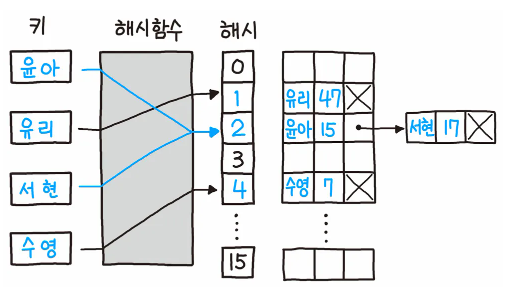 해시 테이블의 기본 방식이기도 한 개별 체이닝(Separate Chaining)은 충돌 발생 시 그림과 같이 연결 리스트로 연결(link)하는 방식입니다. 충돌이 발생한 윤아와 서현은 윤아의 다음 아이템이 서현인 형태로 서로 연결 리스트로 연결되었습니다.