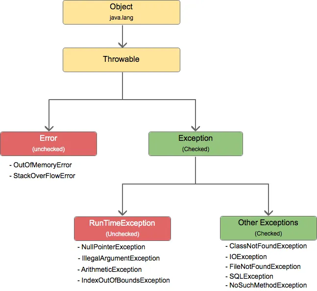 ❗Unchecked는 예외를 처리하거나 전파하는 것이 개발자의 선택이며 강제하지 않는 것이지, 이러한 오류를 처리하지 말라는 뜻은 아닙니다. 명시적으로 try-catch로 처리하거나 throws를 통해 전파하는 코드가 좋습니다.