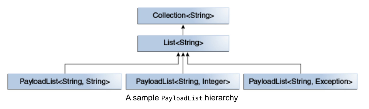 이제 제너릭 타입 파라미터 P의 선택적 값을 각 요소와 연관시키는 자체 List 인터페이스인 PayloadList를 정의한다고 상상해 보십시오. 선언은 다음과 같을 수 있습니다.