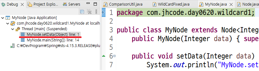 👉 실제로 위 사진에서 우리가 정의하지 않은 MyNode.setData(Object)가 호출된다는 것을 확인할 수 있습니다. 이는 타입 소거의 결과이며 브릿지 메소드가 생성되어 MyNode.setData(Integer) 메소드에게 위임하는 과정입니다. 위임한다는 말은, 기존의 setData(Object data) 메서드가 setData(Integer data) 메서드를 호출한다는 말과 같습니다.